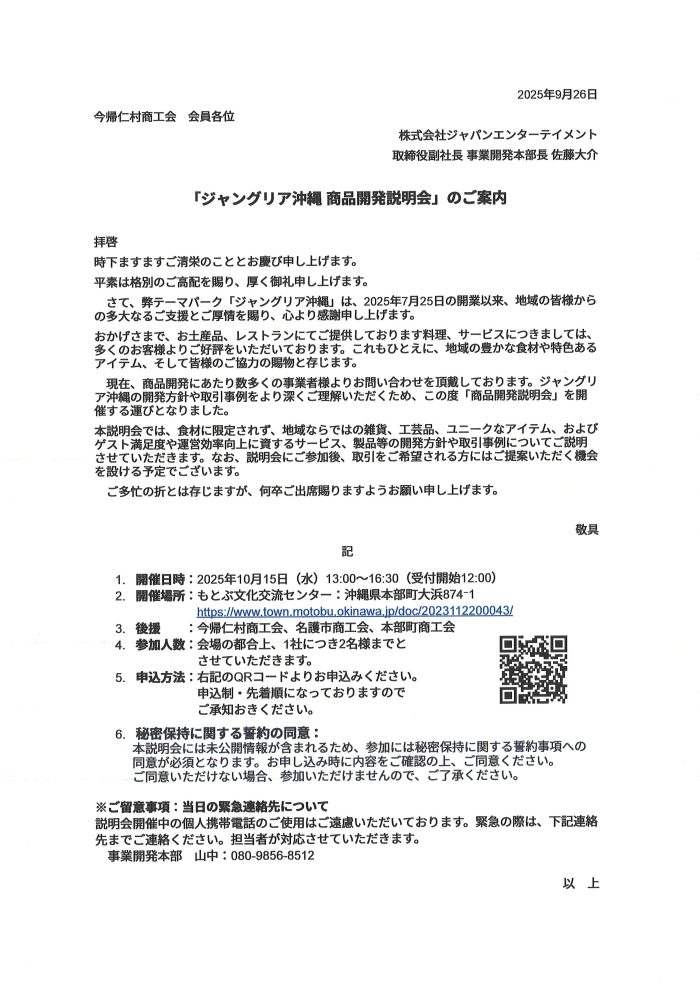 ジャングリア沖縄では新たな地域資源を発掘し、施設内のショップやレストランで取り扱う食材等の商品開発につなげるため、下記の日程で説明会が開催されます。